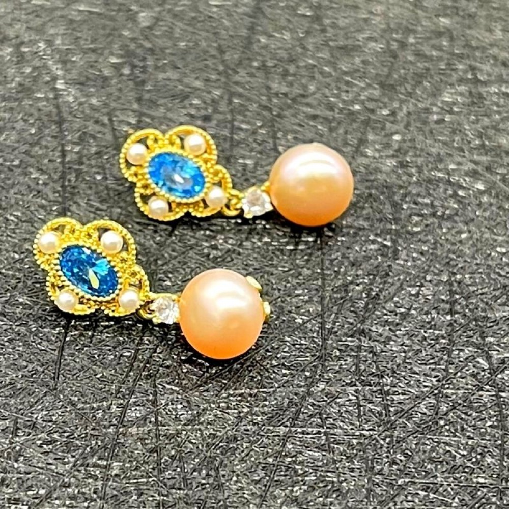 Bule Cubic Zircon Hollow Art Pink Pearl Stud Earring